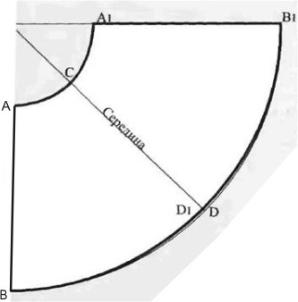 Проводим вертикальную линию и перпендикуляр к ней через точку О. ОА = ОА 1 = радиус = 1/2 обхвата талии /3,14/ (4/4). (Пример: 70 см/2/3,14/(4/4) = 11,15 см.) Дуга АА 1 = полуобхват талии. АВ = А1В1 = длина юбки (Ди ). (Пример: 50 см. Подробнее...