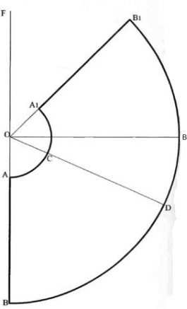 Проводим вертикальную линию и перпендикуляр к ней через точку О. Проводим биссектрису угла FOE. ОВ 1 - биссектриса угла FOE. . ОА = ОА 1 = радиус = ЛА обхвата талии / 3,14/(3/4). (Пример: 70 см / 2 / 3,14 / (3/4) = = 14,86 см. Подробнее...