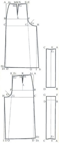Юбка из шести клиньев типа годэ Построение ведется на основе юбки из шести клиньев. Для получения конструкции юбки типа годэ с расширением от уровня бедер проводим из точки Е горизонтальную прямую. ЕЕ 1 = EF. Подробнее...